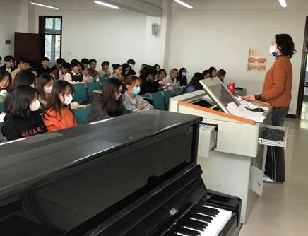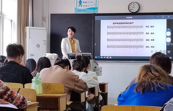 在教学示范课展示环节,周玉娟教授展示的课程是《合唱与指挥》,她结合歌曲情感,层层深入,循循善诱,展示了深厚的专业功底。
