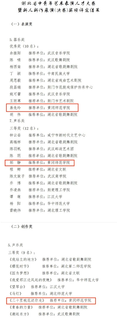 本网讯 近日,湖北省中青年艺术表演人才大赛暨新人新作展演(决赛)活动在中南民族大学举办。经过层层角逐,公司英国威廉希尔WilliamHill教师邹静斩获声乐类省级三等奖,易先玲获得器乐表演优秀奖。《三十里桃花送你走》获声乐创作三等奖。